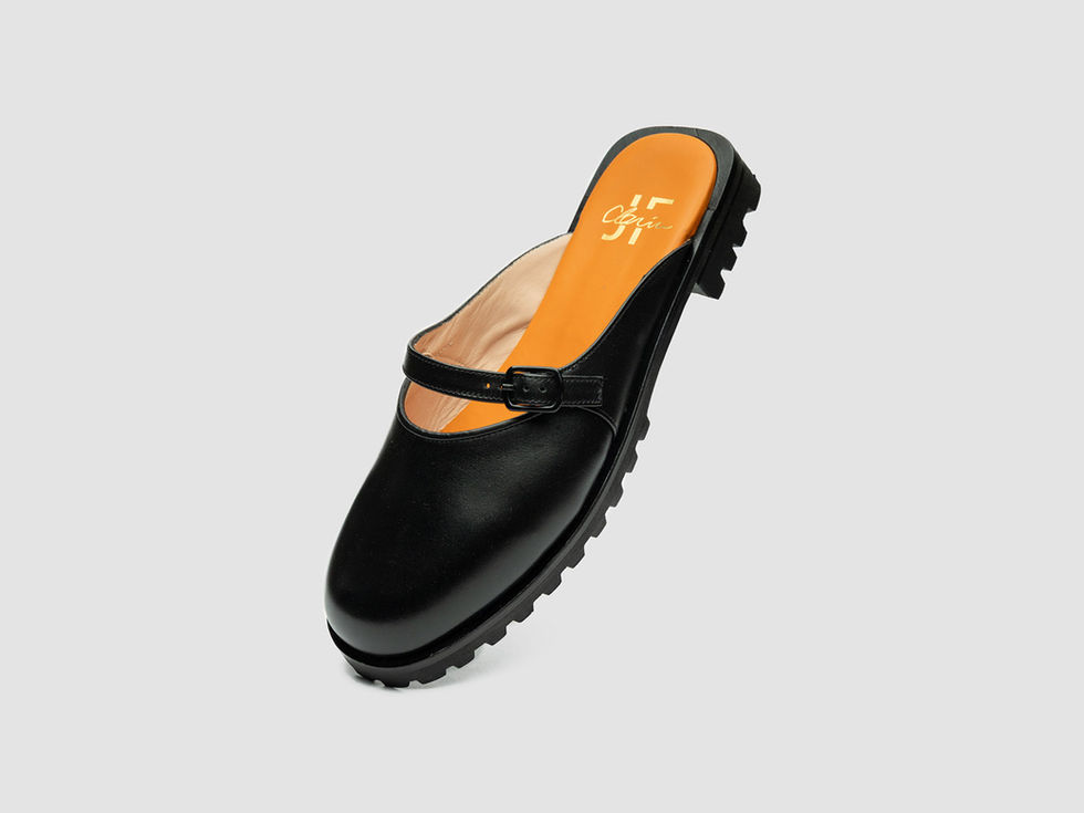 La Mule plate Touquet en cuir noir lisse JF Clarin incarne l’élégance sobre et moderne, pensée pour accompagner la femme contemporaine tout au long de l’été. Réalisée en cuir de veau, elle séduit par la profondeur de sa teinte noire et la finesse de ses lignes. Cette mule à bride réglable présente une boucle noire, qui lui confère un esprit avant- gardiste et citadin, illuminée par sa doublure orange et beige